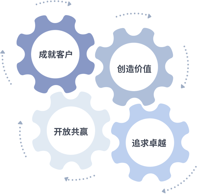 成就客户是一切决策的出发点,,,,创造价值是衡量所有工作的标准,,,追求卓越是我们做事做人的态度,,开放共赢是我们的格局也是最终的结果。。。价值观的齿轮环环相扣,,,,推动着组织里的每个人不断向前。。